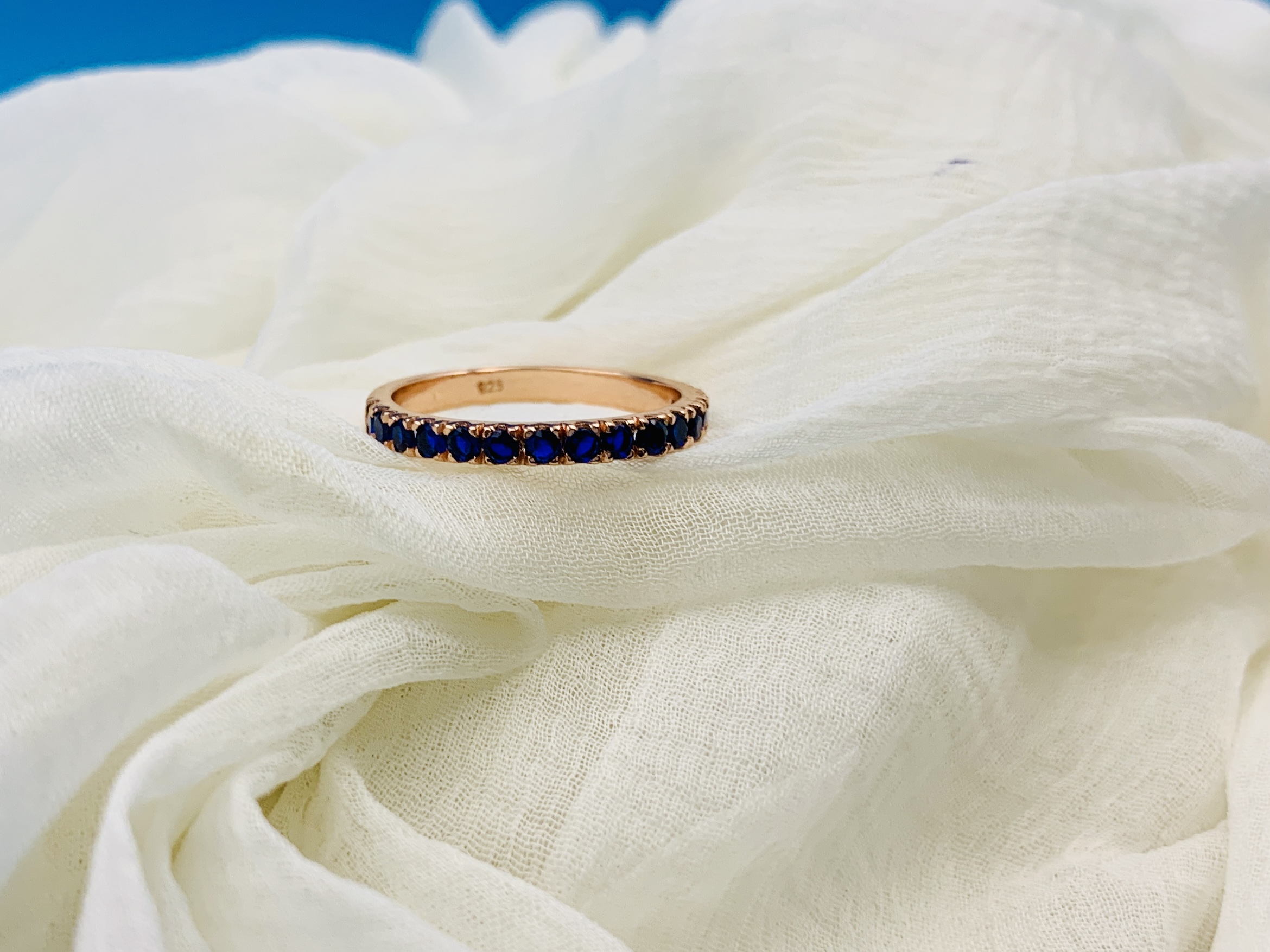 Elegant rose gold plated 925 silver band adorned with deep blue sapphire-like CZ stones. Perfect for stacking, weddings, or everyday wear.
