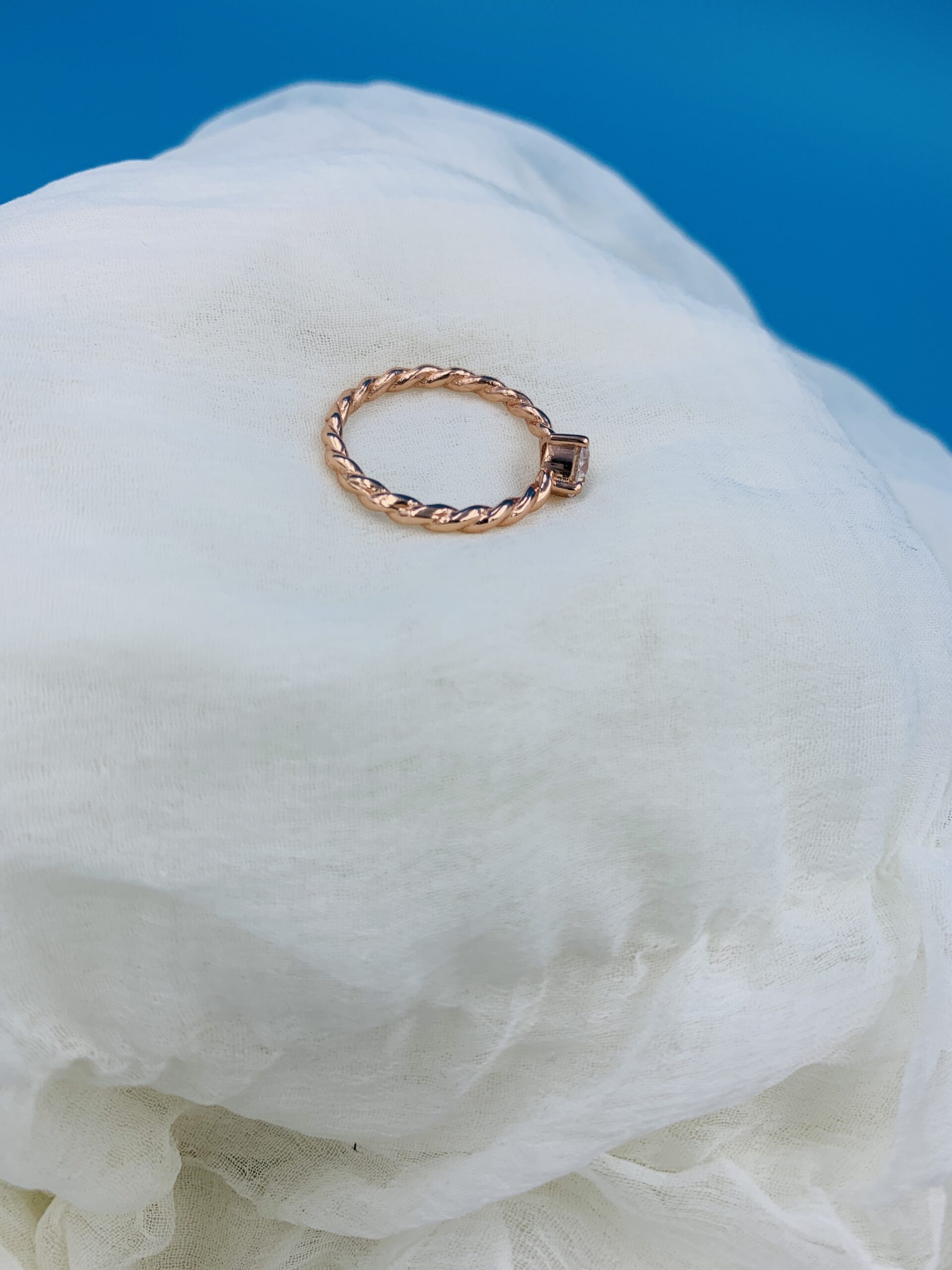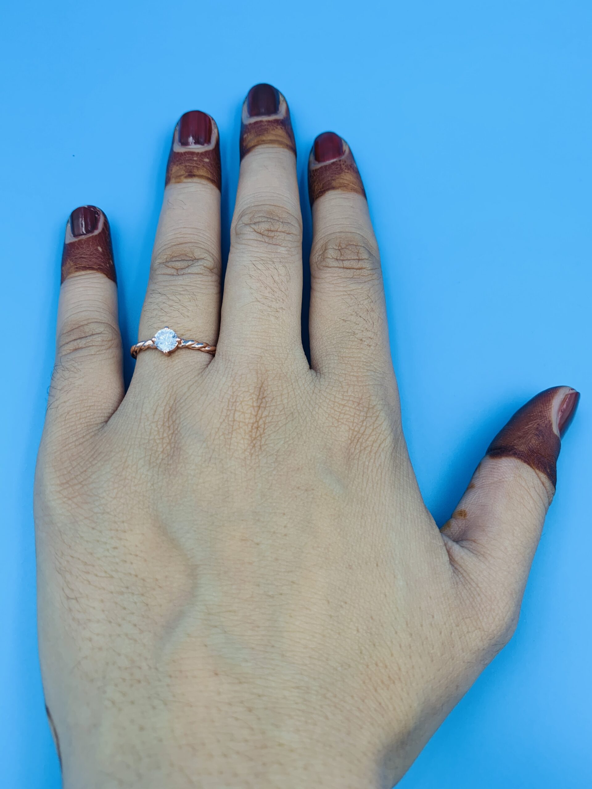Add a touch of elegance to your jewelry collection with this stunning 925 sterling silver solitaire ring. Beautifully crafted with a rose gold plated twisted band, this ring features a sparkling round-cut cubic zirconia stone in a delicate four-prong setting. The intricate twisted design offers a modern twist to a classic style, making it perfect for engagements, promise rings, or as a minimalist everyday accessory.